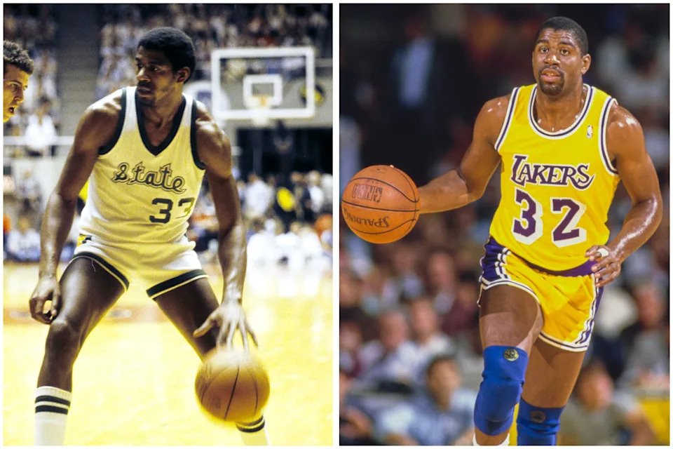 Magic Johnson college dominance: Led Michigan State to the 1979 NCAA Championship, defeating Larry Bird’s Indiana State. NBA: 5× NBA champion in 1980, 1982, 1985, 1987 and 1988 with the Los Angeles Lakers. 3× NBA Finals MVP in 1980, 1982 and 1987. 3× NBA Most Valuable Player in 1987, 1989 and 1990. 12× NBA All-Star: 1980, 1982-1992. 2× NBA All-Star Game MVP in 1990 and 1992. Inducted into the Basketball Hall of Fame in 2002.