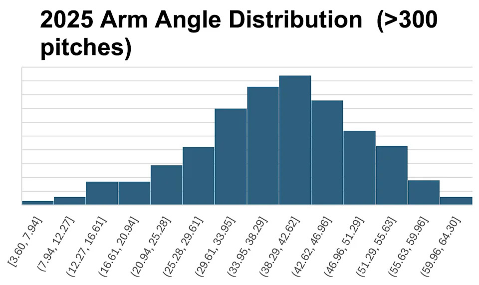 This is a chart showing arm angle distribution from MLB last season, controlling for the top 5 outliers on both ends for data cleanliness. Hoppe currently lives in the third right-most of these bars, with an arm angle higher than about 90% of the sample. Not quite outlier-high, but pretty dang high.