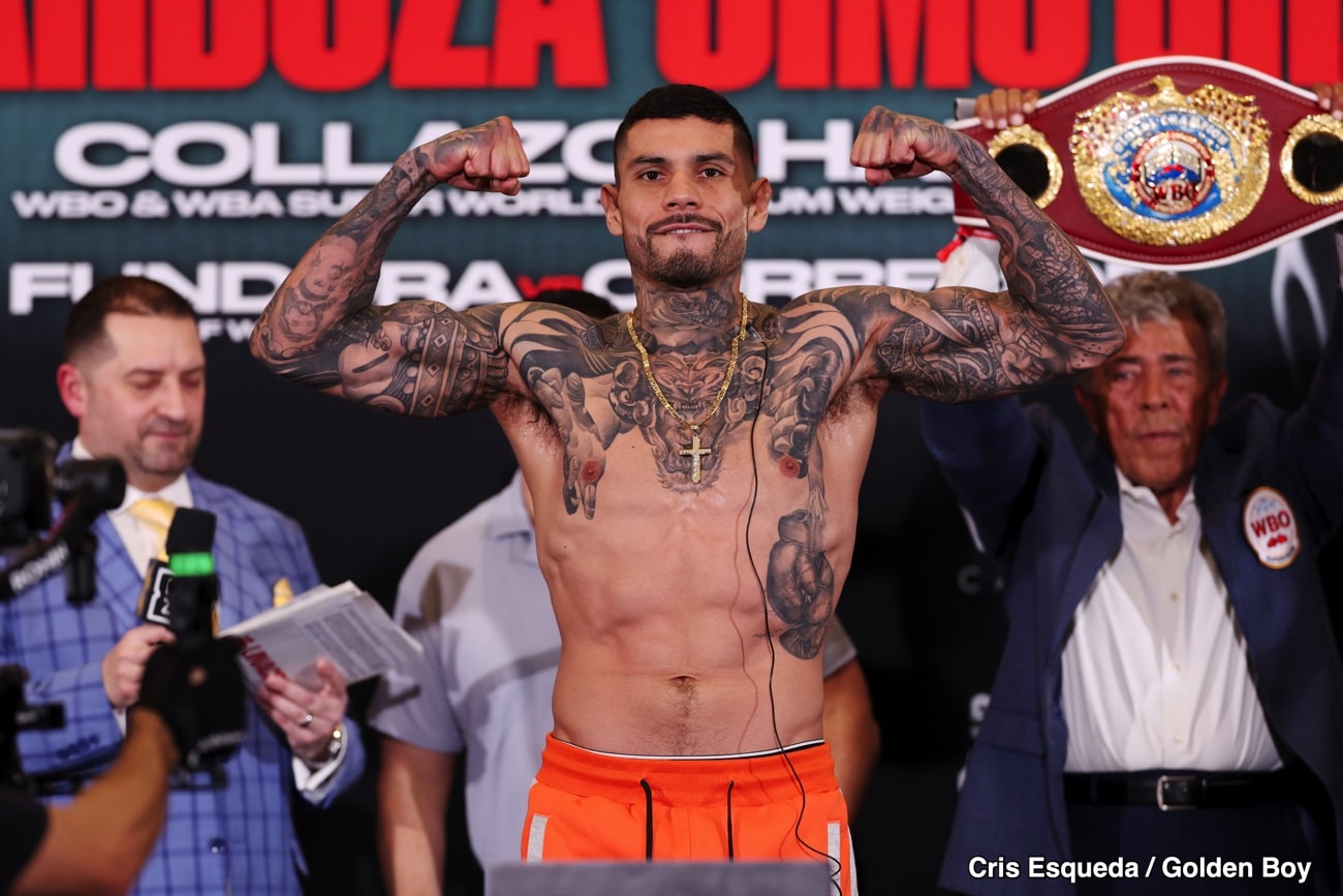 In the co-main event, unified WBO and WBA minimumweight champion Oscar “El Pupilo” Collazo (14-0, 11 KOs) stopped Jesus “Chiquito” Haro (13-4, 2 KOs) after six rounds of their scheduled 12-round fight.