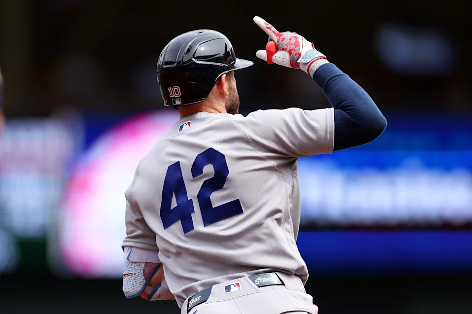 Trevor Story #10 of the Boston Red Sox celebrates his three-run home run as he rounds the bases against the Minnesota Twins in the third inning at Target Field on April 15, 2026, in Minneapolis, Minnesota. All players are wearing the number 42 in honor of Jackie Robinson Day.