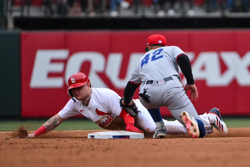 St. Louis Cardinals left fielder Nathan Church (27) slides safely past Cleveland Guardians shortstop Brayan Rocchio (4) for a stolen base during the second inning at Busch Stadium. Players and coaches are wearing number 42 in recognition of Jackie Robinson Day.