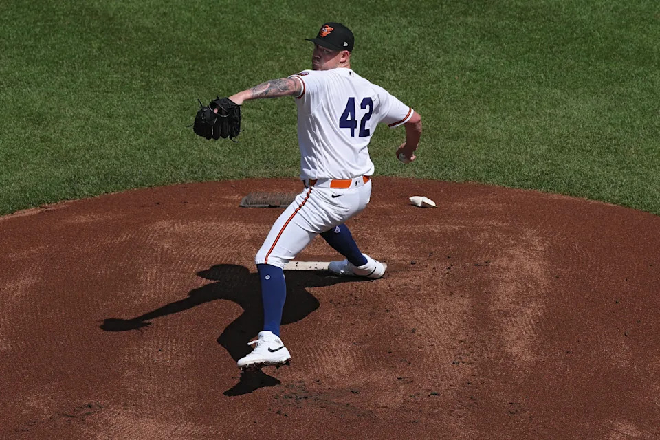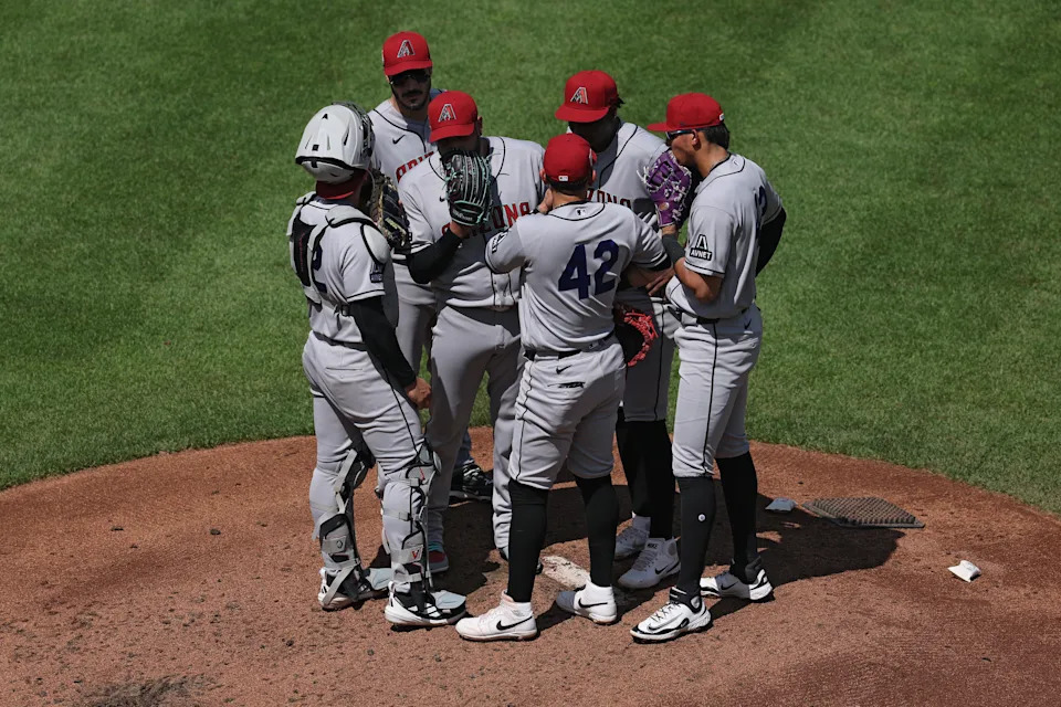 Starting pitcher Eduardo Rodriguez #57 of the Arizona Diamondbacks gathers on the mound with teammates during the second inning against the Baltimore Orioles at Oriole Park at Camden Yards on April 15, 2026, in Baltimore, Maryland. All players are wearing the number 42 in honor of Jackie Robinson Day.