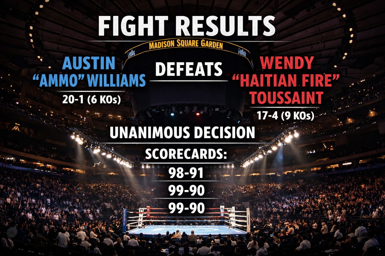 From that point on, Williams dictated the action. He worked behind his jab, went to the body, and spent long stretches cutting off the ring. Toussaint absorbed punishment, particularly in the fifth round when he was trapped along the ropes, but he never stopped competing. After the knockdown, his approach shifted toward survival and discipline, staying upright and avoiding extended exchanges.