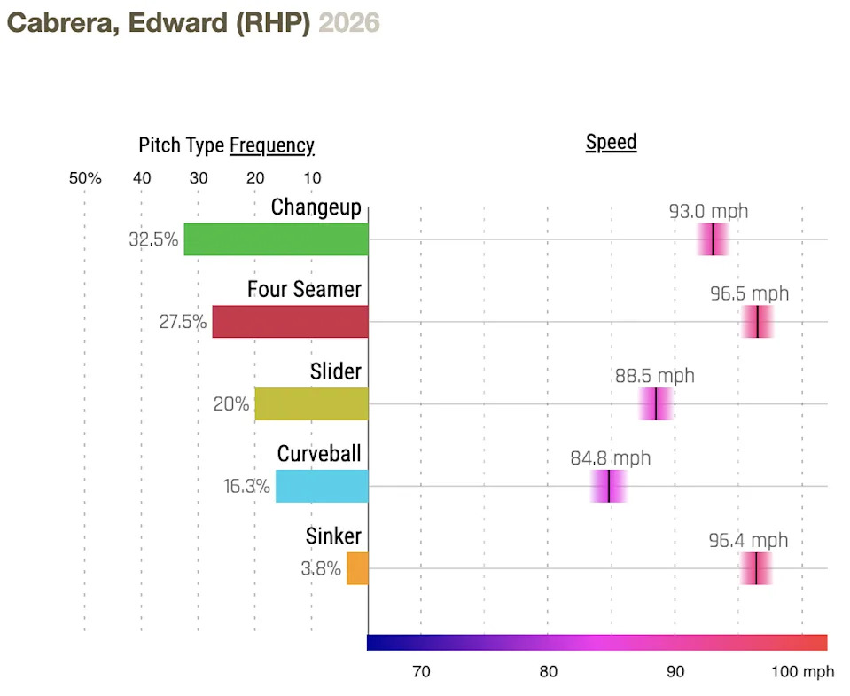 Cabrera was nails in his first 2026 start last Monday against the Angels, allowing just one hit and one walk, striking out five.