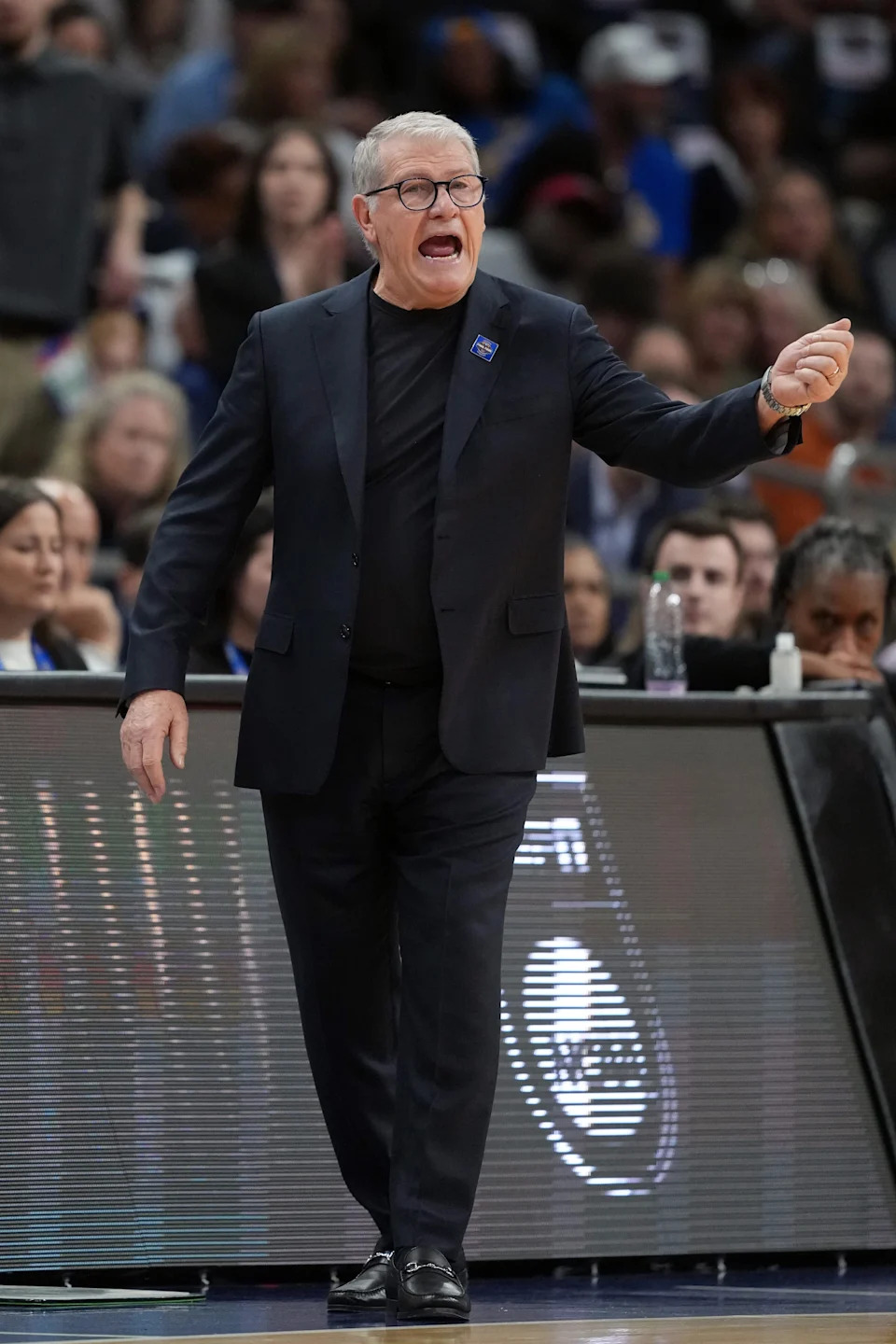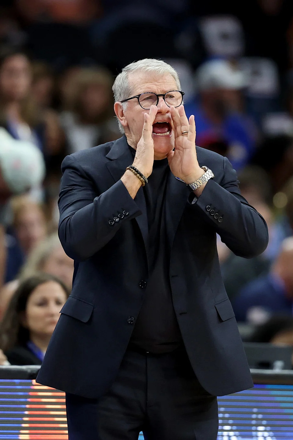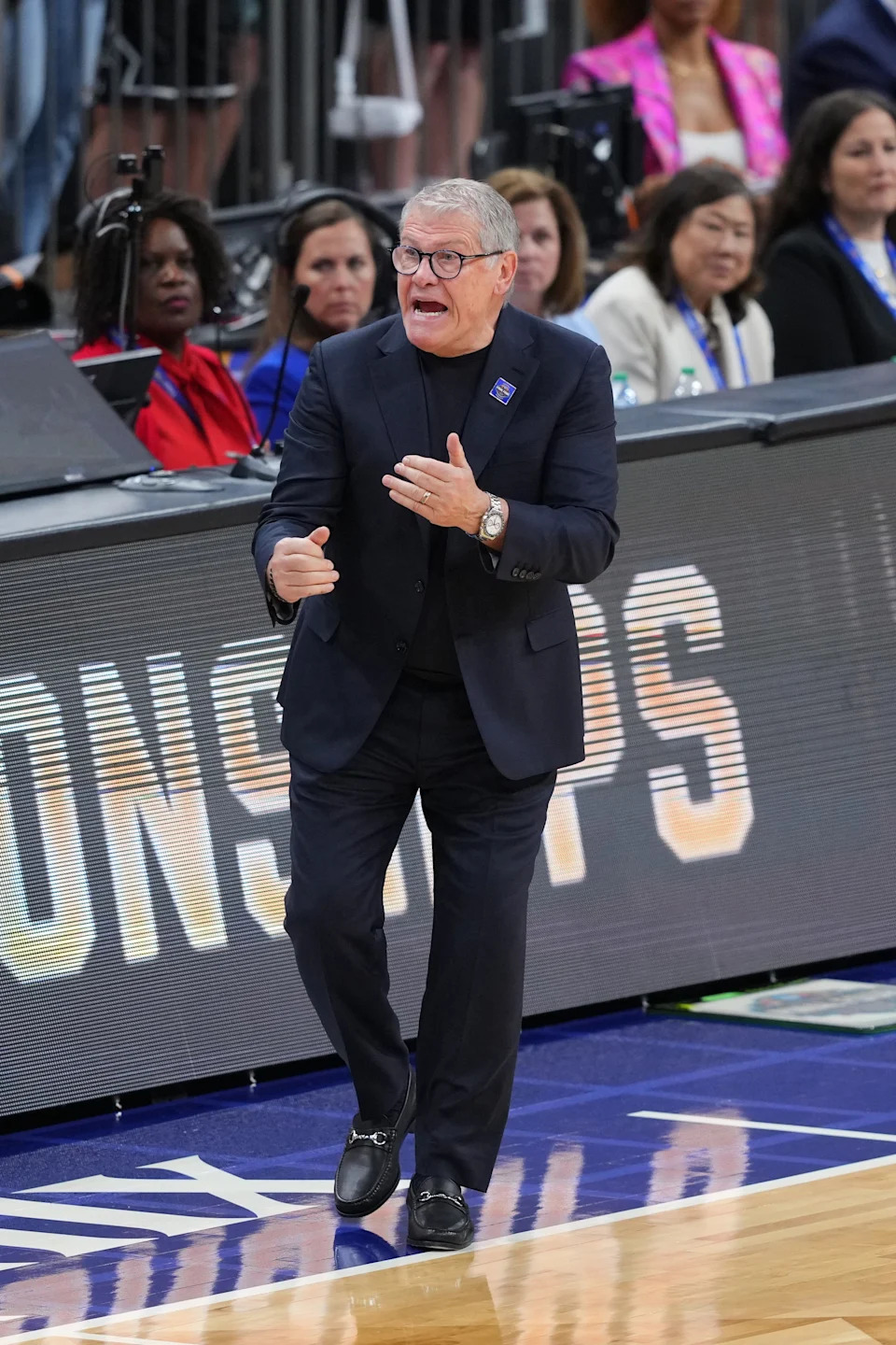 Connecticut head coach Geno Auriemma yells to his team against South Carolina at the Mortgage Matchup Arena during a Final Four semifinal game in Phoenix, Ariz. on April 3, 2026.