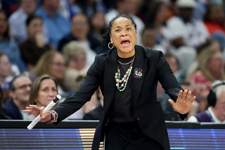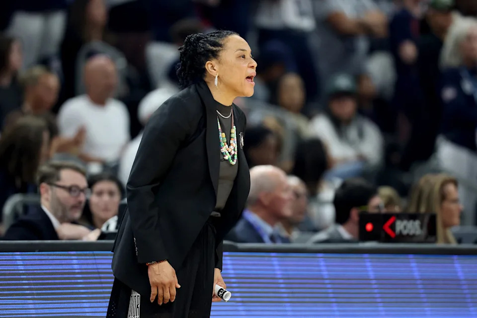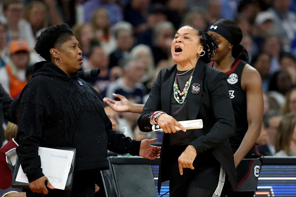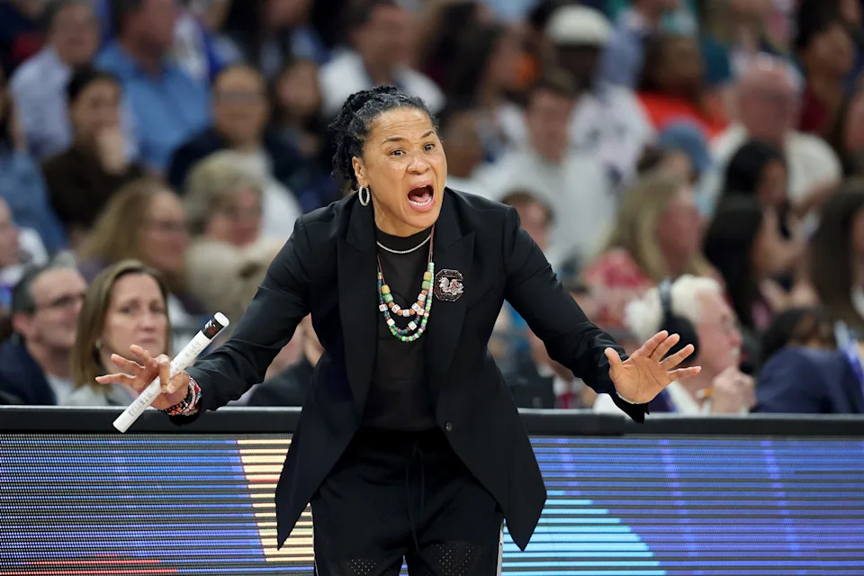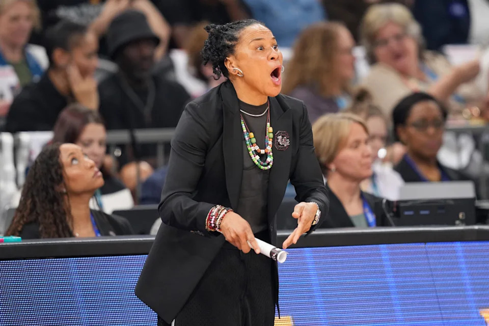 South Carolina Gamecocks head coach Dawn Staley yells out at the referee during their NCAA Women’s Final Four semifinal game against the Connecticut Huskies at Mortgage Matchup Center on April 3, 2026.