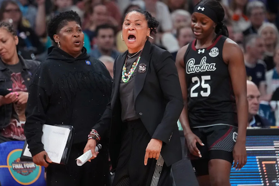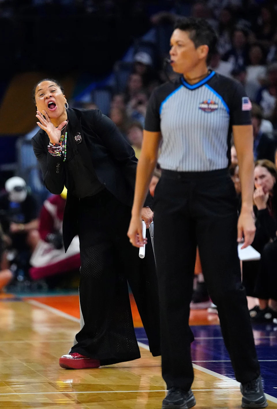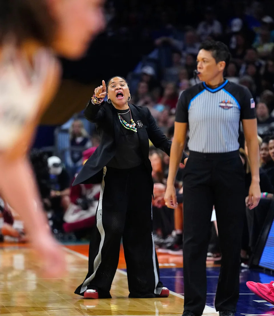 South Carolina head coach Dawn Staley yells to her team around an official against Connecticut at the Mortgage Matchup Arena during a Final Four semifinal game in Phoenix, Ariz. on April 3, 2026.
