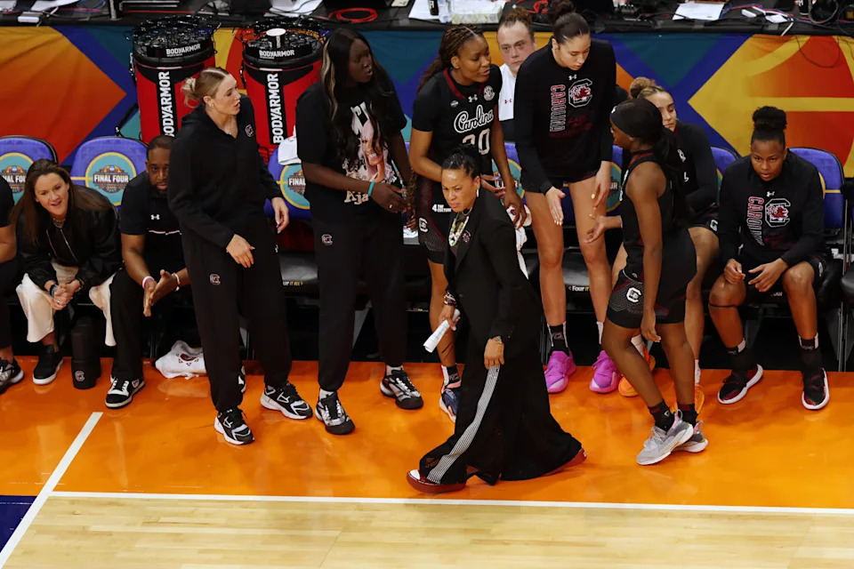 South Carolina Gamecocks head coach Dawn Staley reacts in the first quarter against the UConn Huskies during a semifinal of the Final Four of the women’s 2026 NCAA Tournament at Mortgage Matchup Center.