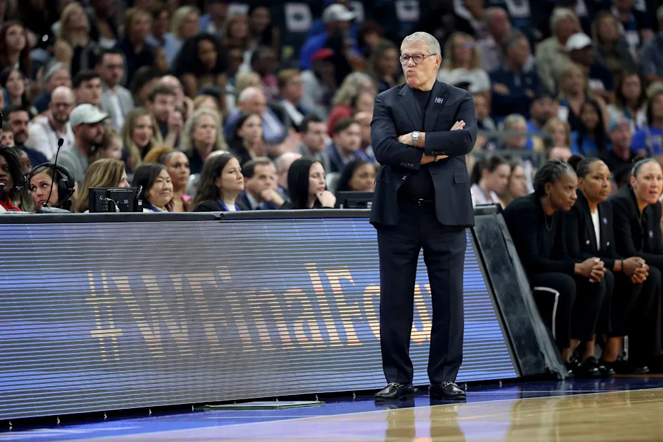 Head coach Geno Auriemma of the UConn Huskies looks on during the first quarter against the South Carolina Gamecocks in the Final Four of the NCAA Women’s Basketball Tournament at Mortgage Matchup Center on April 03, 2026 in Phoenix, Arizona.