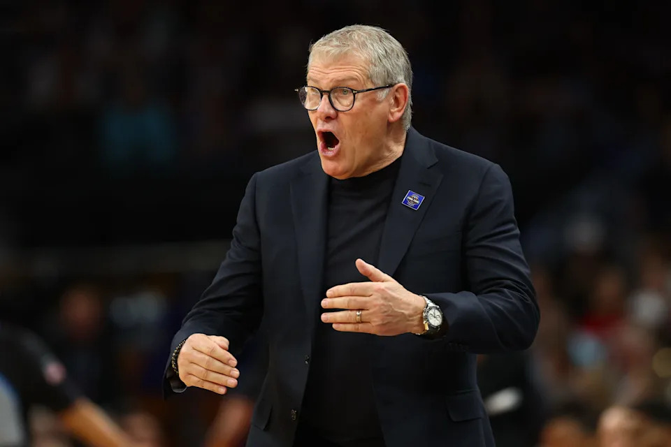 Head coach Geno Auriemma of the UConn Huskies gestures during the third quarter against the South Carolina Gamecocks in the Final Four of the NCAA Women’s Basketball Tournament at Mortgage Matchup Center on April 03, 2026 in Phoenix, Arizona.