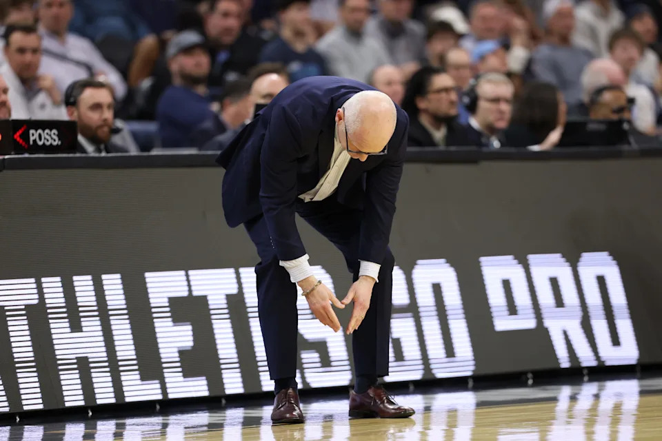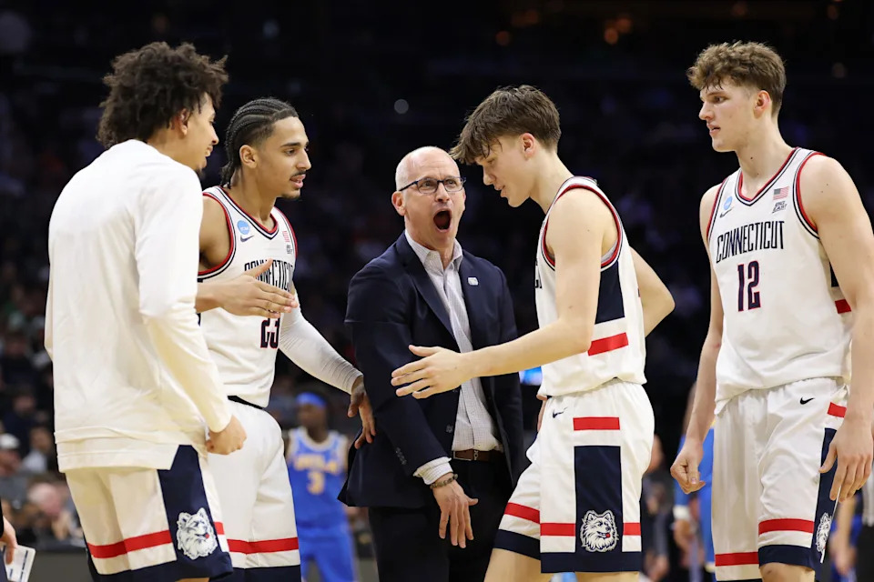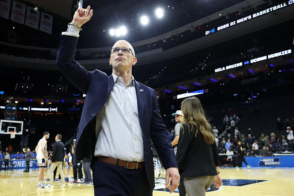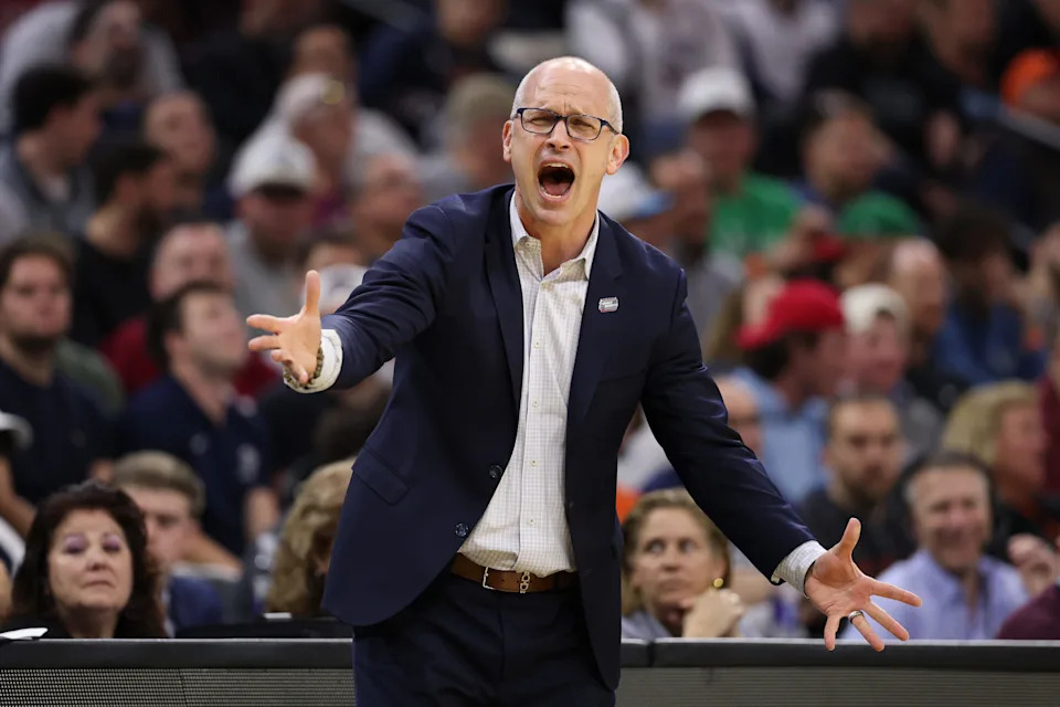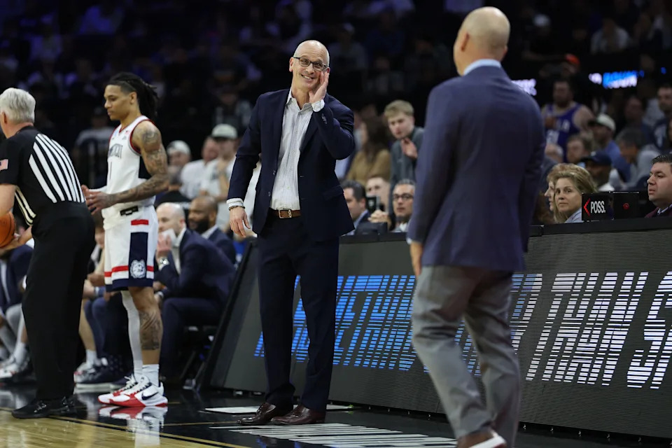 PHILADELPHIA, PENNSYLVANIA – MARCH 22: UConn Huskies head coach Dan Hurley reacts during the first half in the second round of the 2026 NCAA Men’s Basketball Tournament at Xfinity Mobile Arena on March 22, 2026 in Philadelphia, Pennsylvania. (Photo by Emilee Chinn/Getty Images)