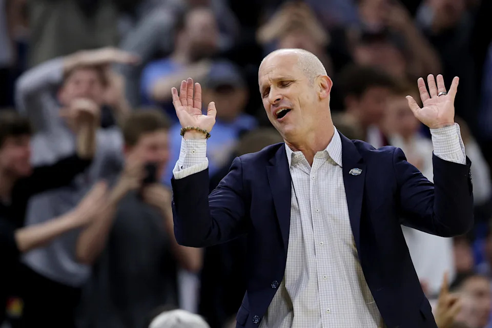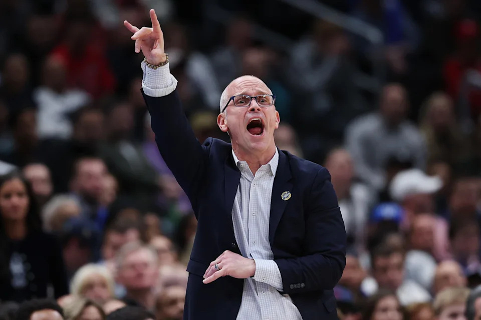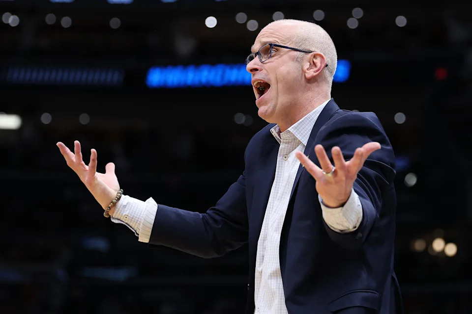 WASHINGTON, DC – MARCH 27: Head coach Dan Hurley of the UConn Huskies reacts during the second half against the Michigan State Spartans in the Sweet Sixteen of the 2026 NCAA Men’s Basketball Tournament at Capital One Arena on March 27, 2026 in Washington, DC. (Photo by Emilee Chinn/Getty Images)