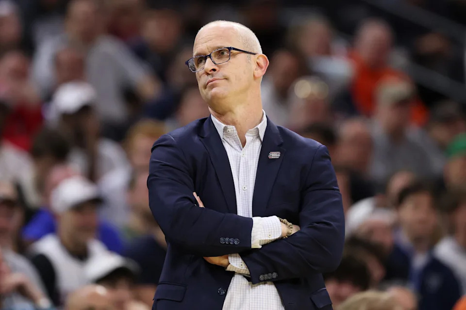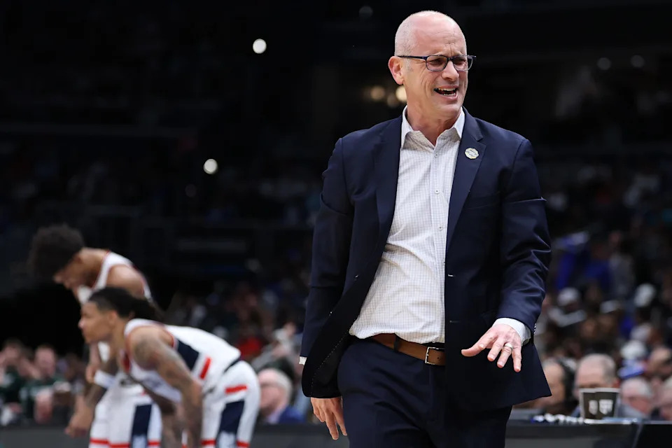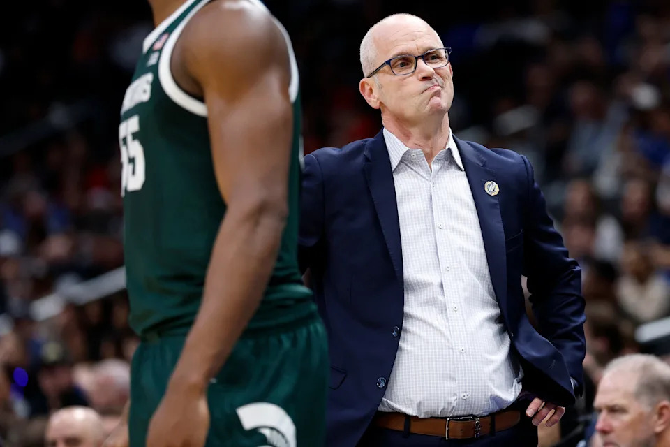 WASHINGTON, DC – MARCH 27: Head coach Dan Hurley of the UConn Huskies looks on during the first half against the Michigan State Spartans in the Sweet Sixteen of the 2026 NCAA Men’s Basketball Tournament at Capital One Arena on March 27, 2026 in Washington, DC. (Photo by Patrick Smith/Getty Images)
