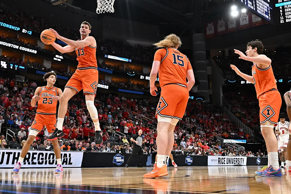 Illinois Fighting Illini center Tomislav Ivisic (13) grabs a rebound against the Houston Cougars in the first half during a Sweet Sixteen game of the South Regional of the men’s 2026 NCAA Tournament at Toyota Center.