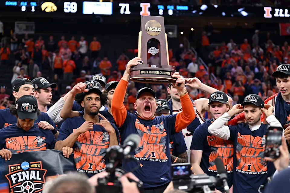Illinois Fighting Illini head coach Brad Underwood celebrates with the trophy on the podium after defeating the Iowa Hawkeyes in an Elite Eight game of the South Regional of the men’s 2026 NCAA Tournament at Toyota Center.