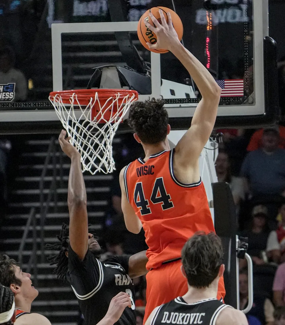 Illinois Fighting Illini center Zvonimir Ivisic (44) dunks against VCU Rams March 21, 2026 during the second half of the NCAA Men’s Basketball Tournament second round game at the Bon Secours Wellness Arena in Greenville, South Carolina.