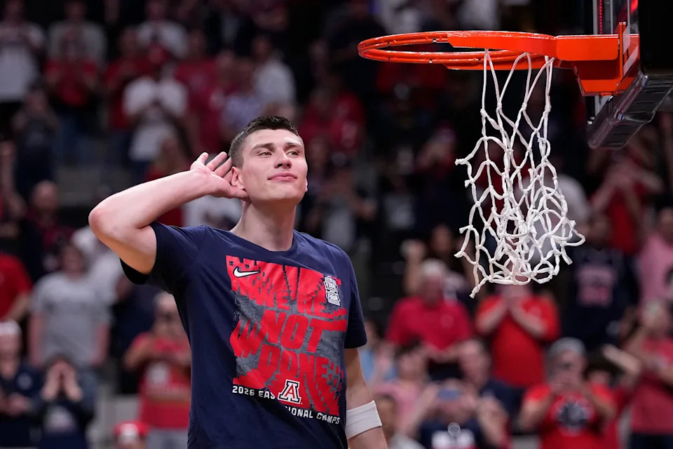 Ivan Kharchenkov #8 of the Arizona Wildcats cuts down the net after defeating the Purdue Boilermakers 79-64 in the Elite Eight of the 2026 NCAA Men’s Basketball Tournament at SAP Center on March 28, 2026 in San Jose, California.