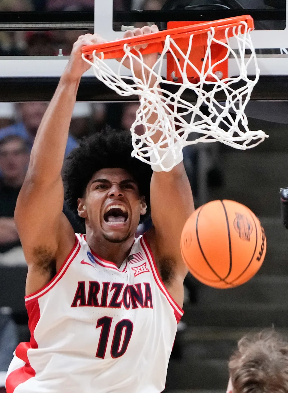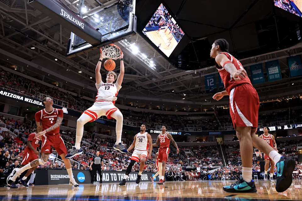 Arizona Wildcats forward Koa Peat (10) dunks the ball against the Arkansas Razorbacks in the second half during a Sweet Sixteen game of the West Regional of the men’s 2026 NCAA Tournament at SAP Center.