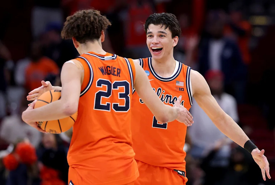 Kylan Boswell #4 and Keaton Wagler #23 of the Illinois Fighting Illini celebrate after defeating the Houston Cougars in the Sweet Sixteen of the 2026 NCAA Men’s Basketball Tournament at Toyota Center on March 26, 2026 in Houston, Texas.