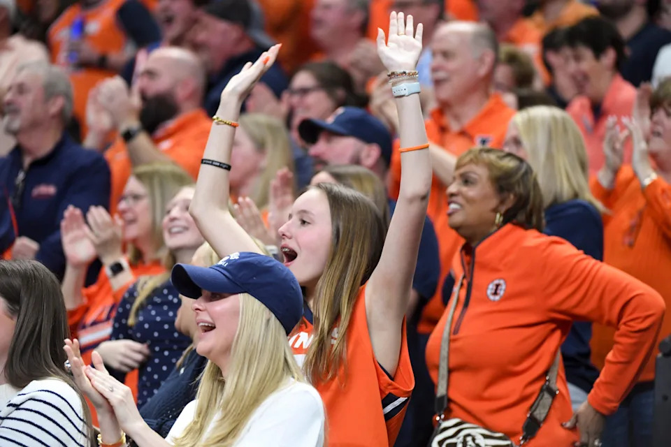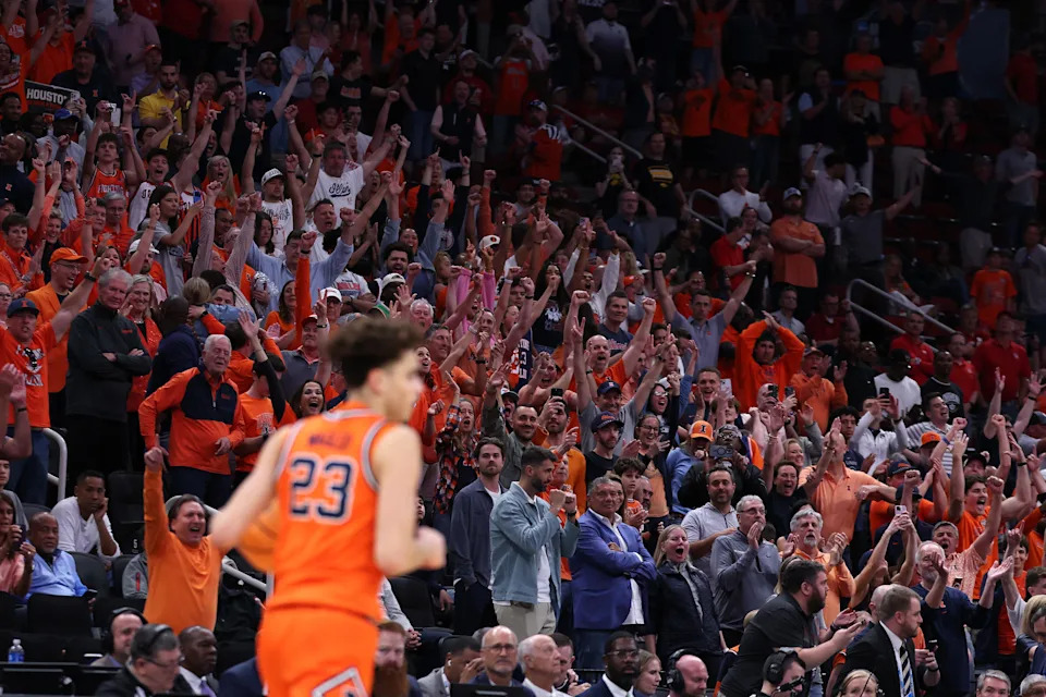 Illinois Fighting Illini fans cheer against the Houston Cougars during the second half in the Sweet Sixteen of the 2026 NCAA Men’s Basketball Tournament at Toyota Center on March 26, 2026 in Houston, Texas.