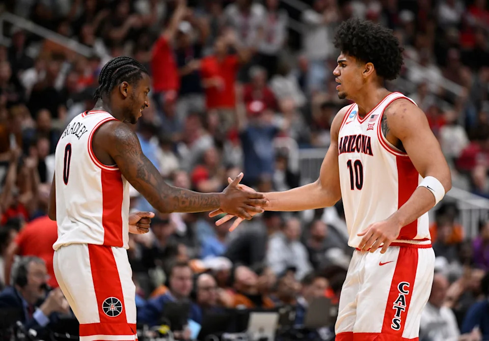 Arizona Wildcats guard Jaden Bradley (0) high-fives Arizona Wildcats forward Koa Peat (10) against the Arkansas Razorbacks in the second half during a Sweet Sixteen game of the West Regional of the men’s 2026 NCAA Tournament at SAP Center.