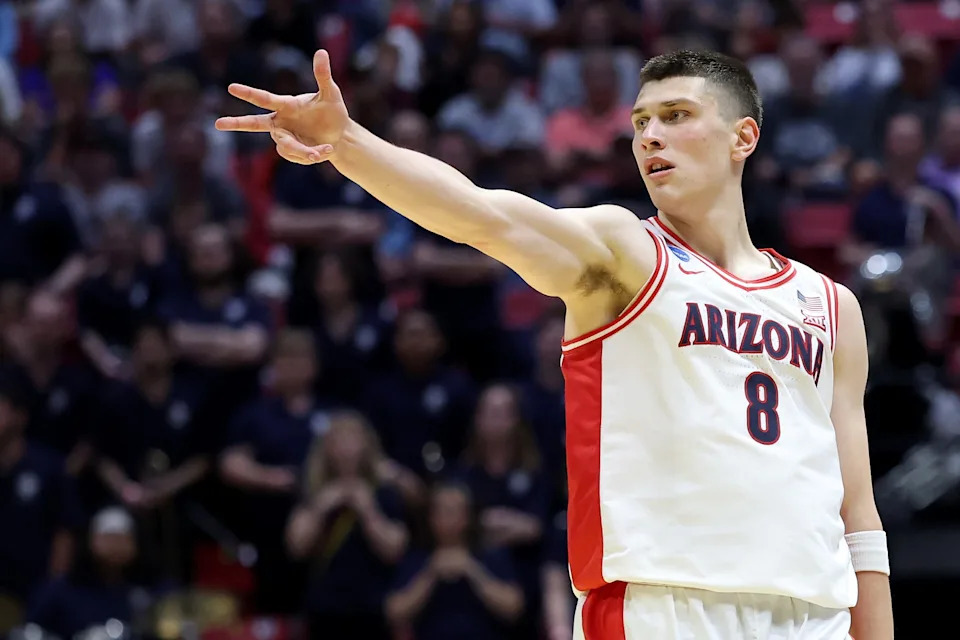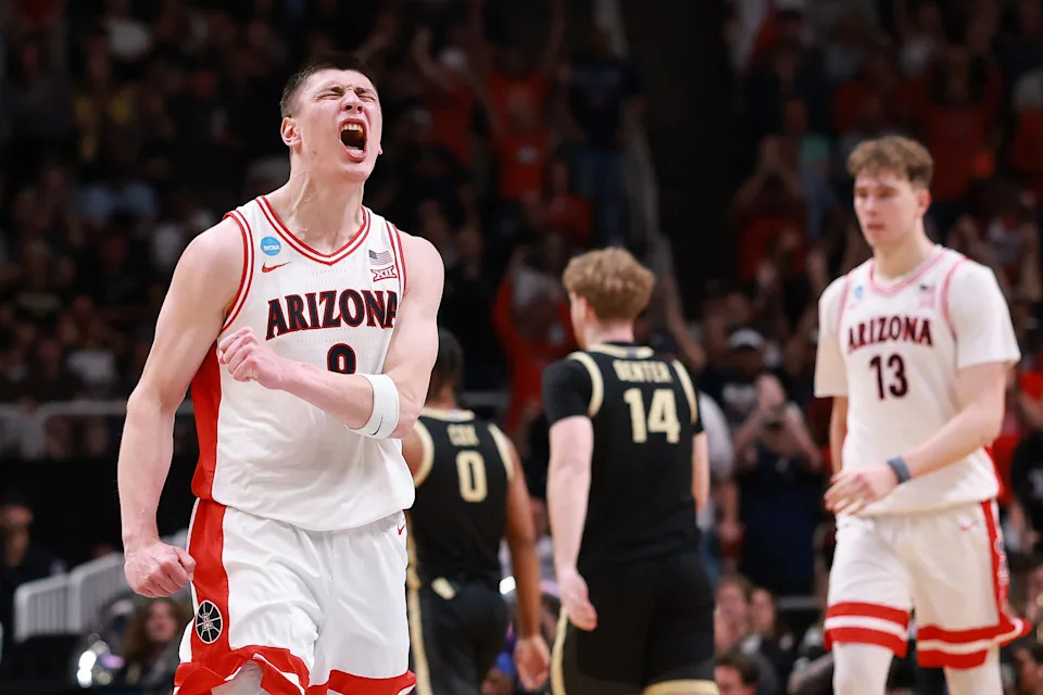 Ivan Kharchenkov #8 of the Arizona Wildcats reacts during the second half of a game against the Purdue Boilermakers in the Elite Eight of the 2026 NCAA Men’s Basketball Tournament at SAP Center on March 28, 2026 in San Jose, California.