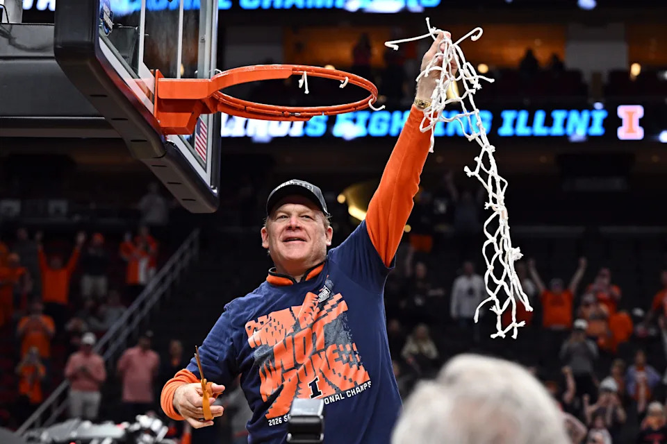Illinois Fighting Illini head coach Brad Underwood celebrates after cutting down the net after defeating the Iowa Hawkeyes in an Elite Eight game of the South Regional of the men’s 2026 NCAA Tournament at Toyota Center.
