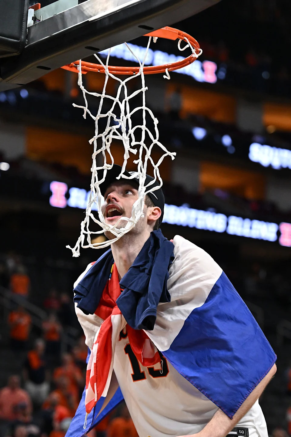 Illinois Fighting Illini center Tomislav Ivisic (13) cuts down the net after defeating the Iowa Hawkeyes in an Elite Eight game of the South Regional of the men’s 2026 NCAA Tournament at Toyota Center.