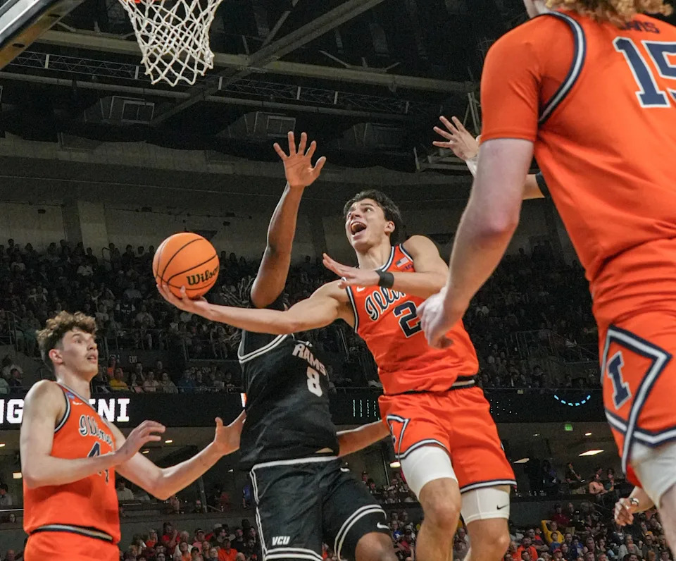 Illinois Fighting Illini guard Andrej Stojakovic (2) scores near VCU Rams forward Michael Belle (8) March 21, 2026 during the first half of the NCAA Men’s Basketball Tournament second round East Region game at the Bon Secours Wellness Arena in Greenville, South Carolina.