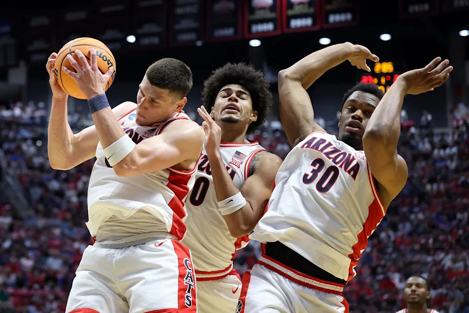 Ivan Kharchenkov #8 of the Arizona Wildcats rebounds the ball in front of teammates Koa Peat #10 and Tobe Awaka #30 during the first half against the Utah State Aggies in the second round of the 2026 NCAA Men’s Basketball Tournament at Viejas Arena at San Diego State University on March 22, 2026 in San Diego, California.
