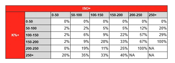 The obvious question looking at these two tables is how does a player that excels in multiple categories see their likelihood of a debut change. Because all of the Cardinals prospects here played their age 17 season, I will look exclusively at that cohort while throwing out the BB+ metric as a factor (sorry Yeferson). The grid below maps K%+ against ISO+. Using Kenly Hunter as the example again, he would slot into the fourth row down (150-200 K%+) and the second column from the left (50-100 ISO+). This maps him to a group of players that have historically made it for at least one big-league at-bat 9% of the time.