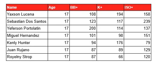 Yaxson Lucena is the only player on this list repeating the DSL. He put up an 89 wRC+ across 130 plate appearances in his age 16 season in 2024, and then crushed the league in 2025 with a 1.5 BB/K ratio and 140 wRC+. Lucena is another player with a great plate approach and excellent contact skills, but it remains to be seen how much power he can get to. He has played exclusively corner outfield and DH thus far in his career.