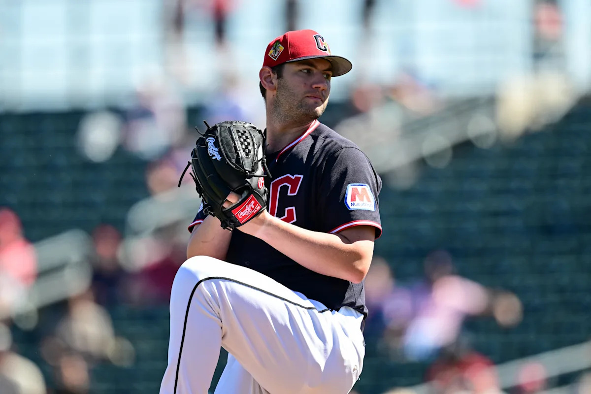 GOODYEAR, ARIZONA – MARCH 06, 2026: Gavin Williams #32 of the Cleveland Guardians throws a pitch during the second inning of a spring training game against the Los Angeles Angels at Goodyear Ballpark on March 06, 2026 in Goodyear, Arizona. (Photo by Chris Bernacchi/Diamond Images via Getty Images) | Diamond Images/Getty Images