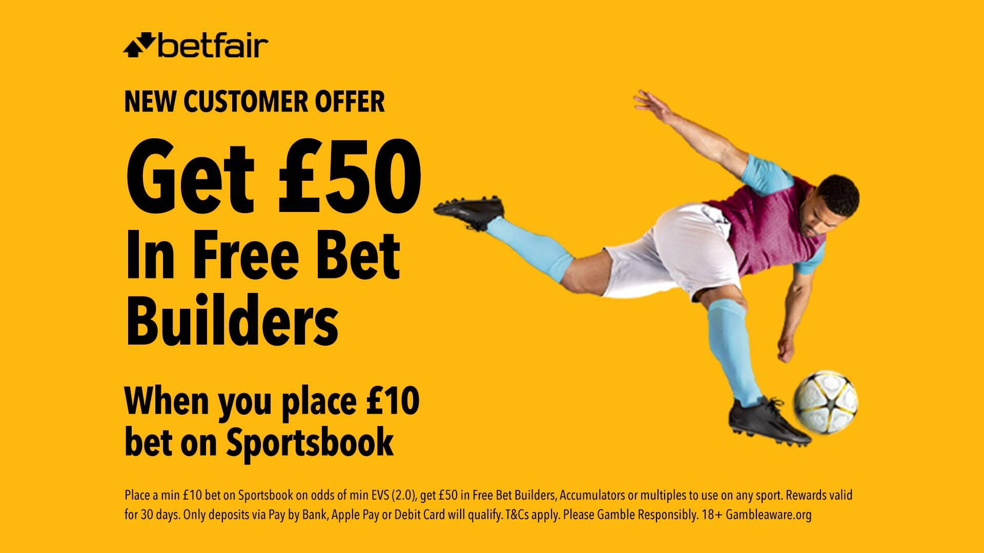 *Betfair. 18+. Place a min £10 bet on Sportsbook on odds of min EVS (2.0), get 5x £10 in Free Bet Builders, Accumulators or multiples to use on any sport. Rewards valid for 30 days. Only deposits via Pay by Bank, Apple Pay or Debit Card will qualify. T&Cs apply. Please Gamble Responsibly.