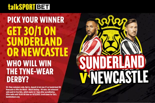 *18+ New customers only. Opt in, deposit & bet max £1 on Sunderland OR Newcastle to Win the Match – Match Betting – 90 mins. Get enhanced odds paid in Free Bets, which expire in 7 days after accreditation. Offer valid until 14:00 UK time on 14/12/2025. Scroll down for T&Cs. GambleAware.org
