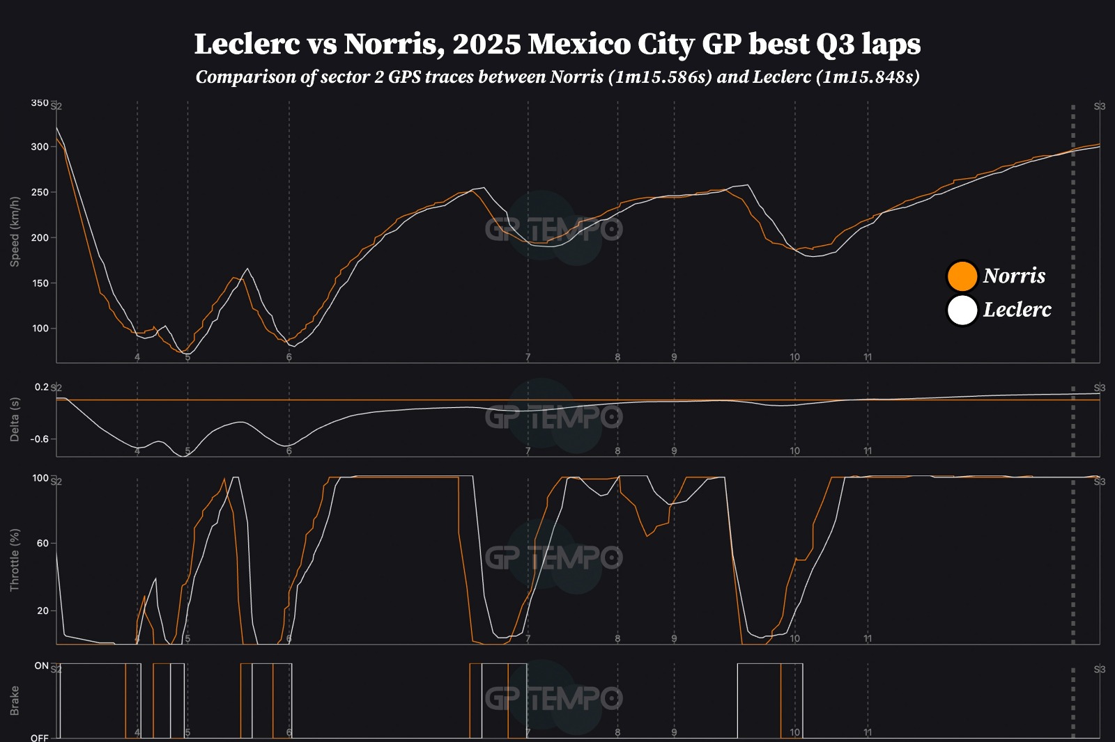 Sector 2: Leclerc aggressive through Turns 4-5-6, but Norris reclaims time through Esses