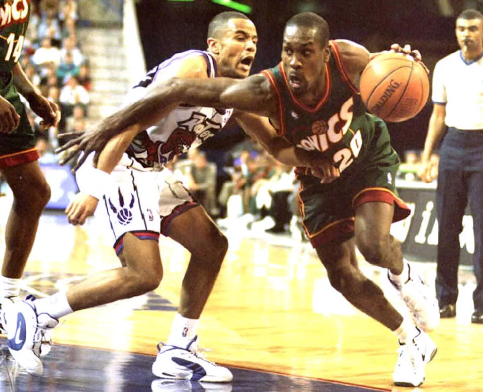 Seattle SuperSonics point guard Gary Payton drives to the basket around Toronto Raptor Damon Stoudamire in the second half at Toronto’s Skydome on Nov. 21, 1995.