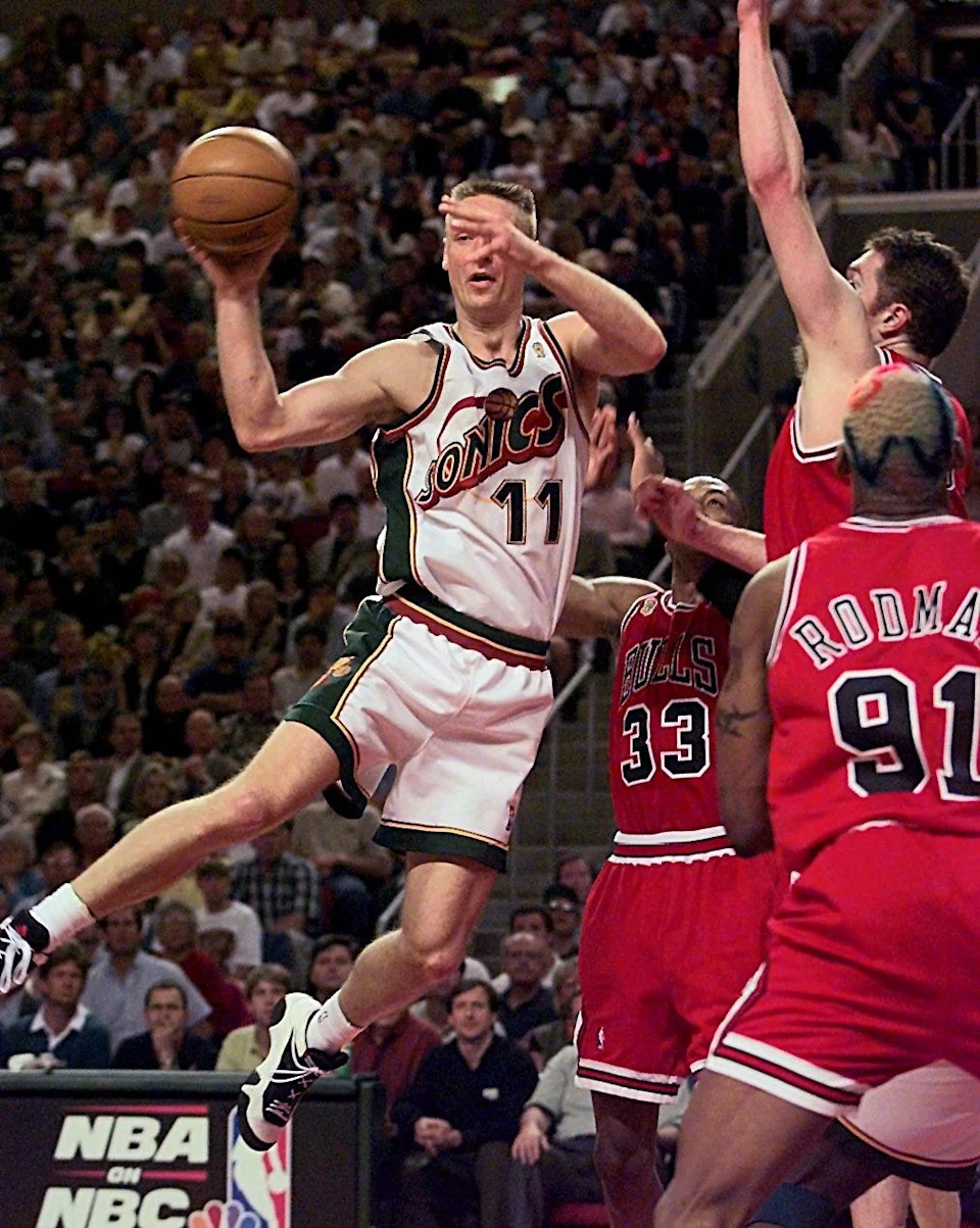 Seattle’s Detlef Schrempf (11) , left, flies as he passes the ball during NBA Finals Game 3 on June 9, 1996 in Seattle. At left are Chicago’s Luc Longley (13) and Dennis Rodman (91)