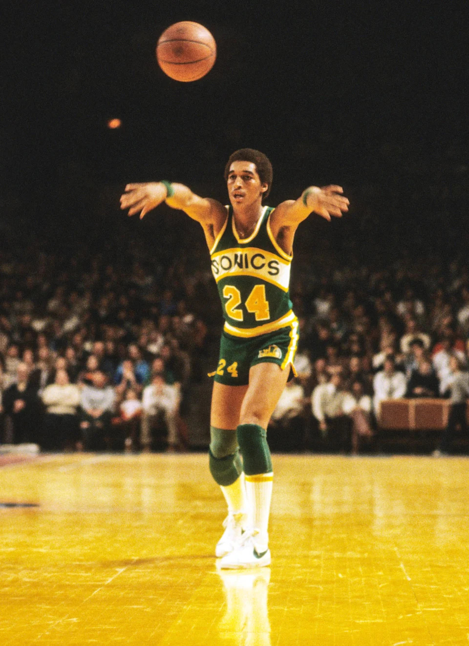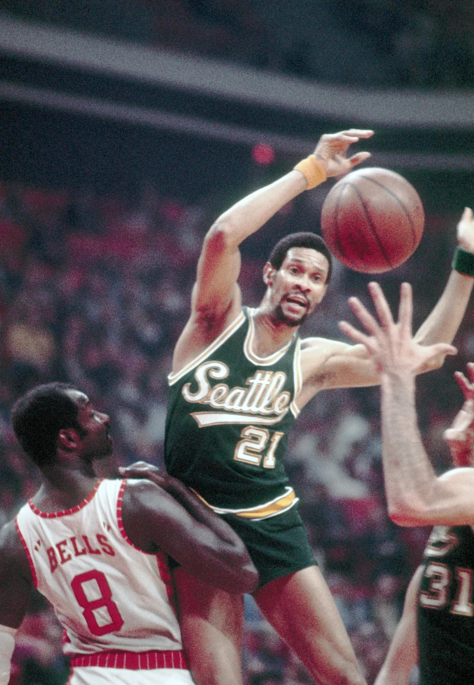Seattle SuperSonics guard Dennis Johnson passes the ball.