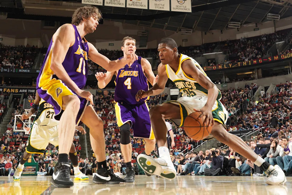 Kevin Durant of the Seattle SuperSonics drives against Pau Gasol #16 and Luke Walton #4 of the Los Angeles Lakers at Key Arena Feb. 24, 2008 in Seattle, Washington. The Lakers defeated the Sonics 111-91.