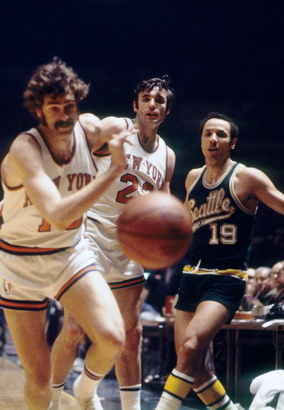 New York Knicks forward Phil Jackson, left, forward Dave DeBusschere and Seattle SuperSonics guard Lenny Wilkens in action at Madison Square Garden on March 9, 1971.