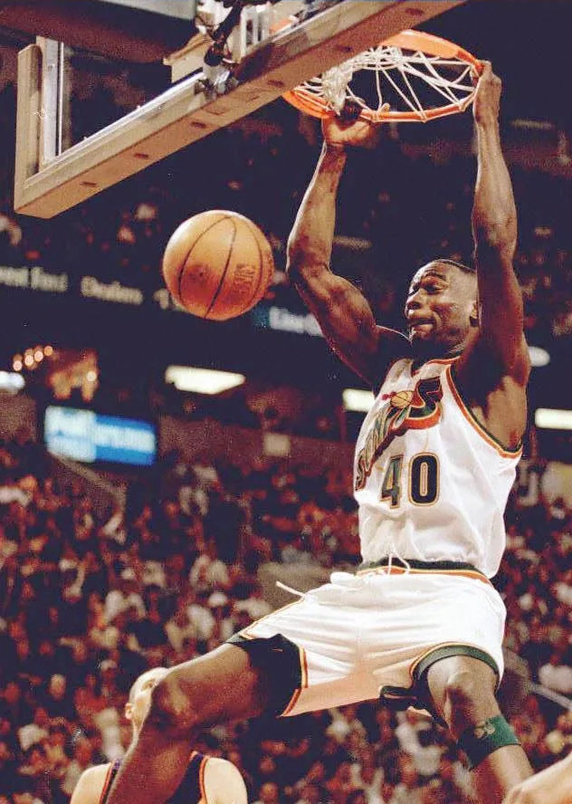 Seattle SuperSonics player Shawn Kemp slam dunks the ball for two of his 21 points against the Phoenix Suns during their Western Conference NBA playoff game on May 3, 1997. The Sonics beat the Suns 116-92 to advance to the conference semi-finals against the Houston Rockets.