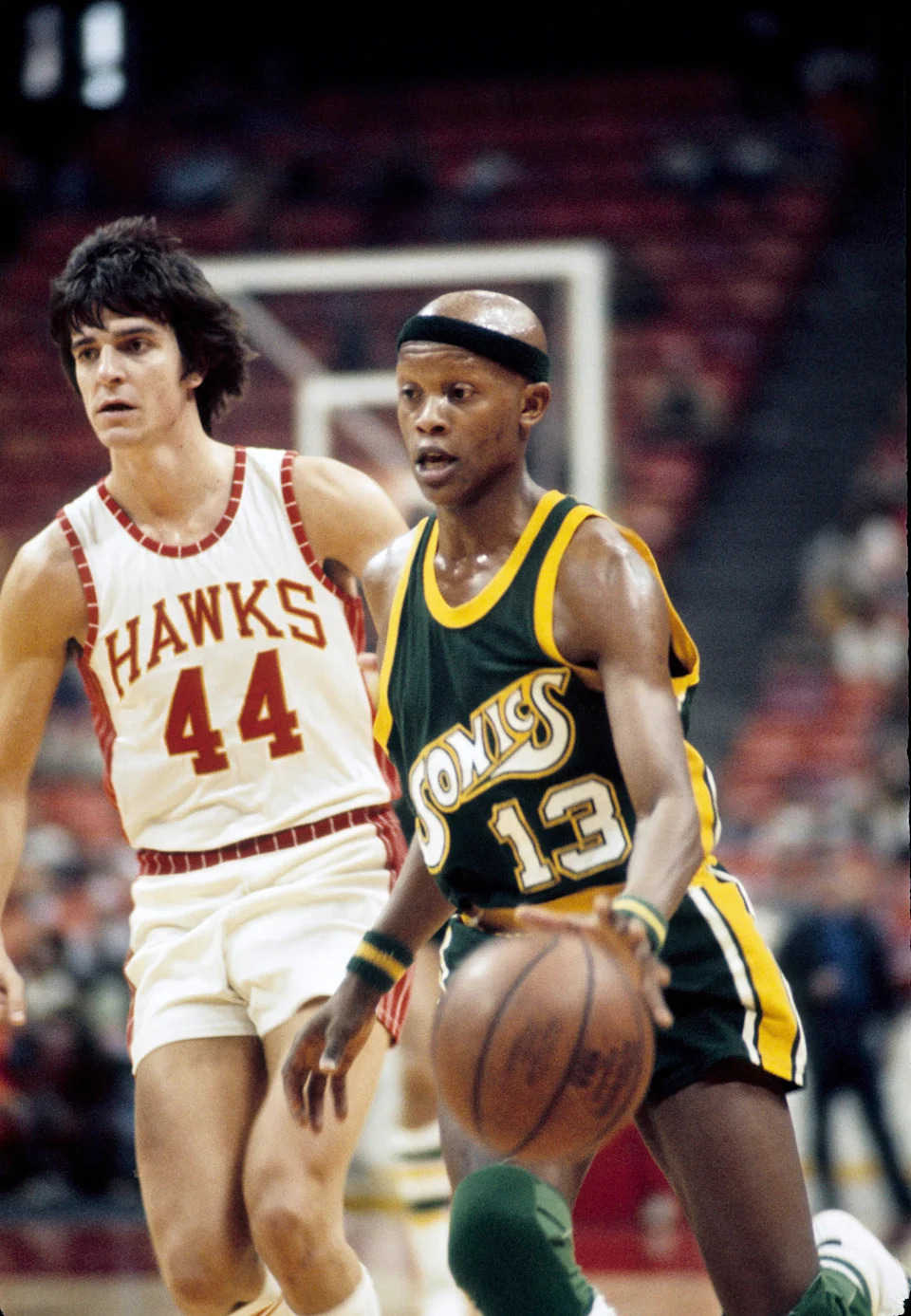 Seattle Supersonics guard Don Watts is defended by Atlanta Hawks guard Pete Maravich at The Omni on Dec. 1, 1973 in Atlanta.