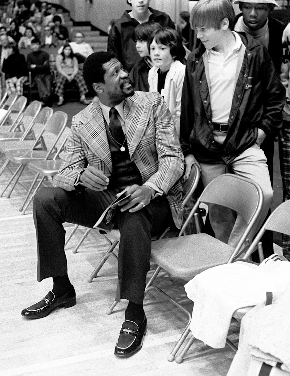 Bill Russell, left, head coach and general manager of the Seattle SuperSonics, talks to fans while waiting to coach the Pacific-8 against the SEC in the first round of the first annual Four-Star Classic at Memorial Gym in Nashville on April 9, 1974.