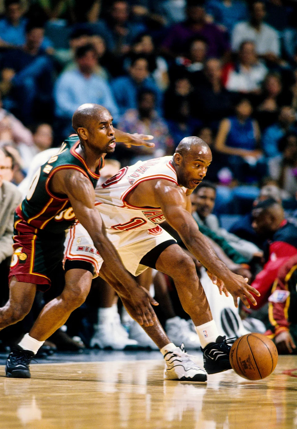 Miami Heat guard Tim Hardaway (10) in action against Seattle Seattle SuperSonics guard Gary Payton (20) at the Miami Arena on Feb. 28, 1997.