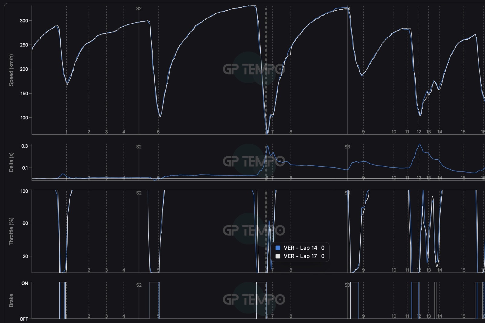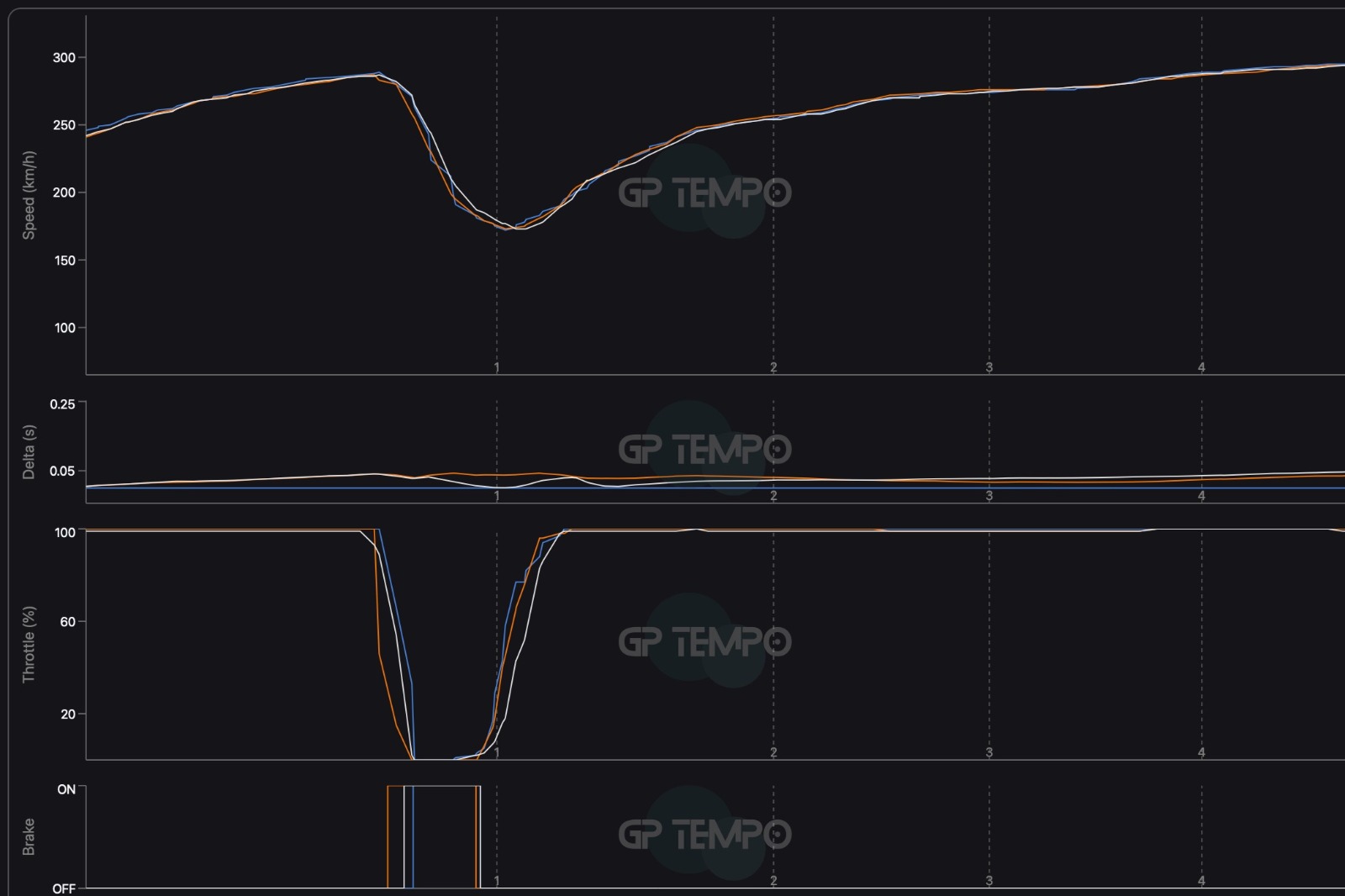 If we compare Verstappen’s first lap with both McLaren drivers, the differences in sector one are marginal but Max emerged fractionally ahead, chiefly as a result of Norris (orange trace) being more conservative in his braking and throttle shape into Turn 1. Piastri (white trace) is later off the throttle and onto the brake, but not as late as Verstappen (blue trace).