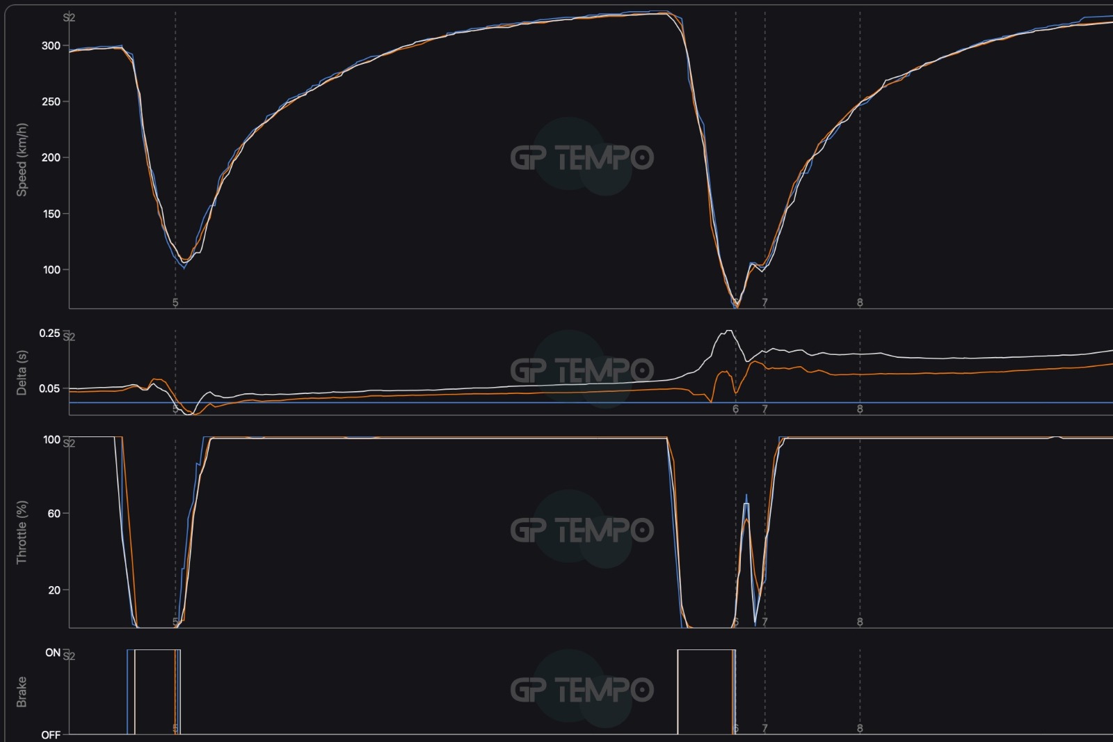 Into sector two, we can see both McLarens briefly overturned Verstappen’s advantage at Turn 5, where the track slopes down towards the apex, compounding the tendency of cars with an understeer balance to scrub off speed. But actually the loss here was partly a result of Max braking fractionally earlier, blending this more aggressively with his removal of the throttle to encourage the back end to slide a little more and help get the car pointing the right way at the exit.