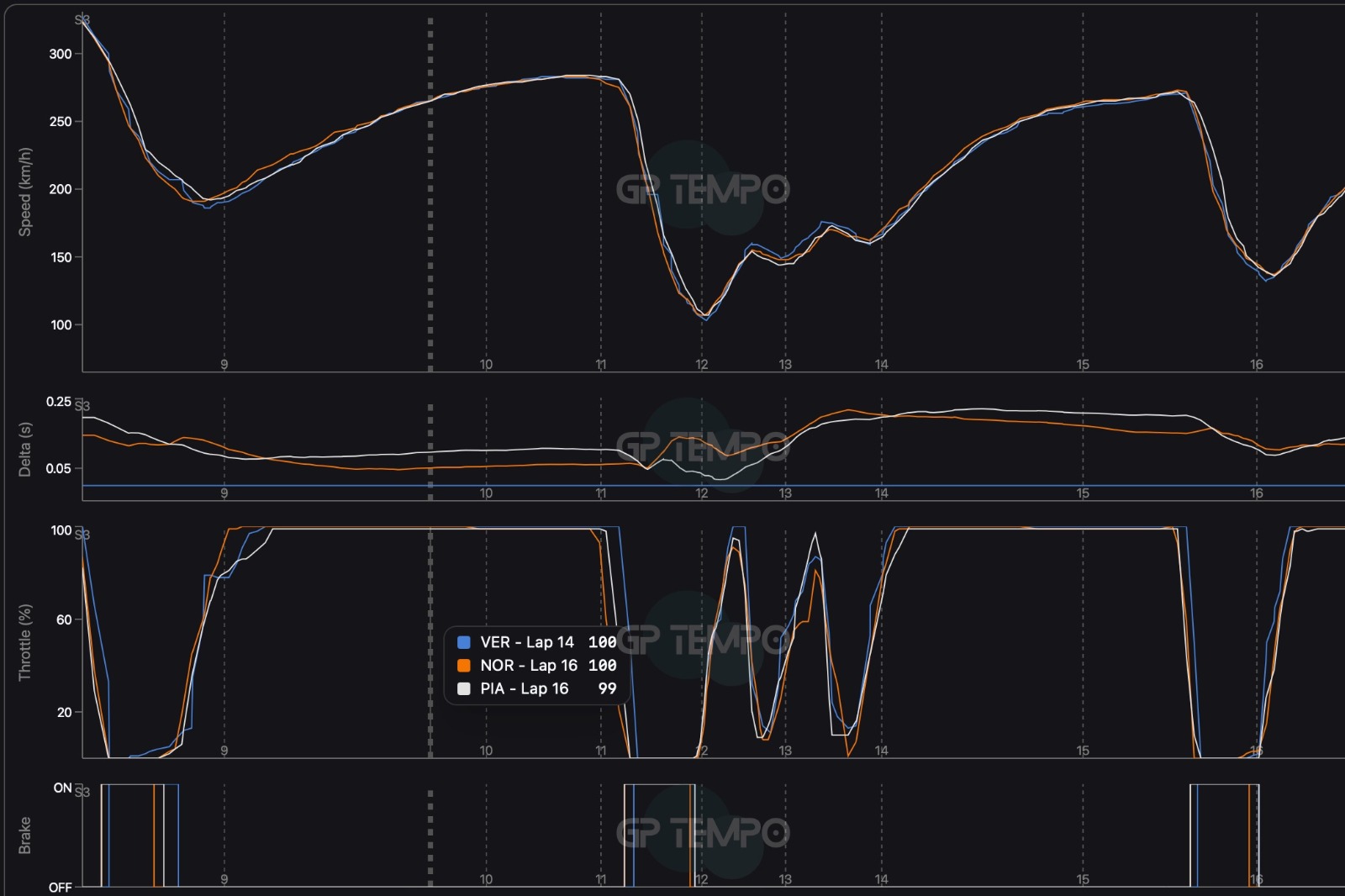 Both McLarens had scrubbed off more speed than Verstappen as they threw their cars into Turn 6, though, and this was where Verstappen built his advantage. Piastri’s sharper throttle profile in the chute recouped some of what he had lost to his team-mate, but not enough to Verstappen, and the gap then opened again on the following straight.