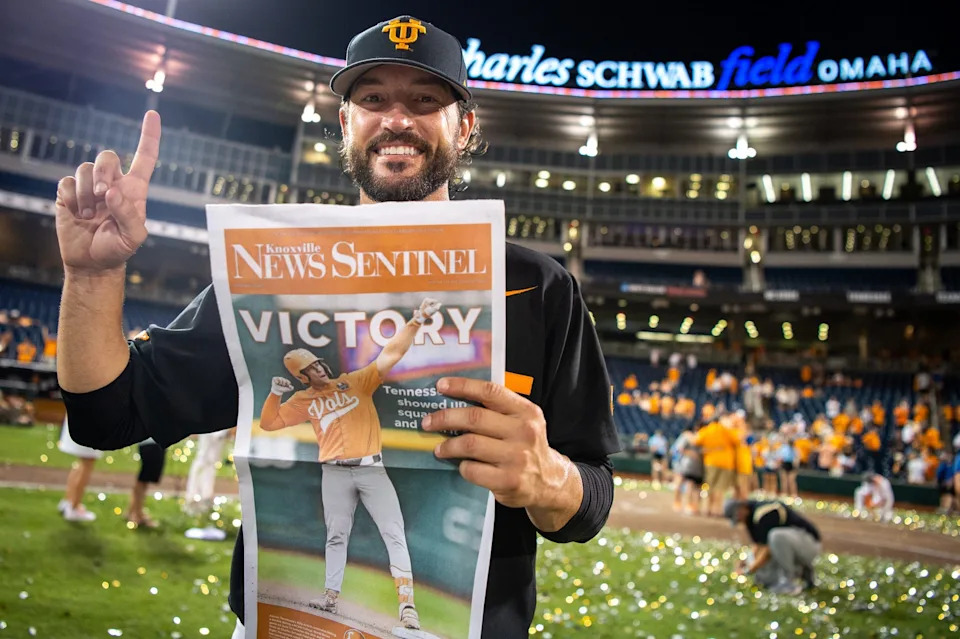 Tennessee head coach Tony Vitello holds up a commemorative News Sentinel front page after Game 3 of the NCAA College World Series finals between Tennessee and Texas A&M at Charles Schwab Field in Omaha, Nebraska on Monday, June 24, 2024.