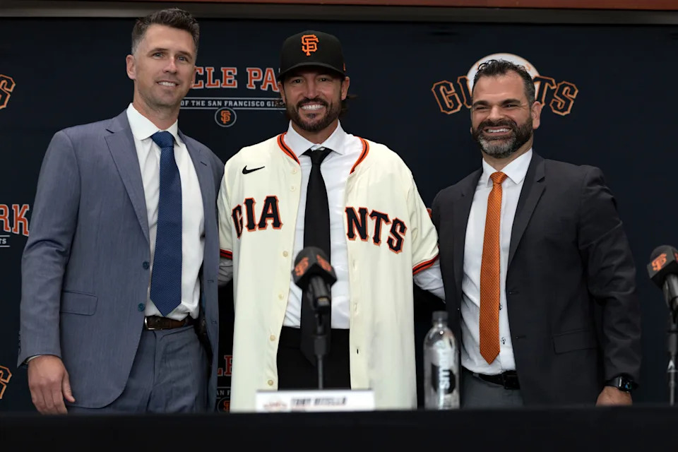 Tony Vitello (center) is introduced as the new manager of the San Francisco Giants by president of baseball operations Buster Posey (left) and general manager Zack Minasian at Oracle Park on Oct. 30, 2025.